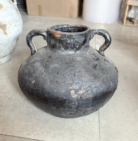 Wabi Sabi แจกันตกแต่งเซรามิกสีดำย้อนยุคพร้อมที่จับสองด้ามกระถางดอกไม้ทำมือ