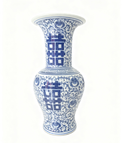 แจกันเซรามิกสีฟ้าและสีขาวมีลวดลายความสุขสองเท่าของตกแต่งงานแต่งงานแบบจีนโบราณแจกันสีฟ้าและสีขาววัฒนธรรมจีน
